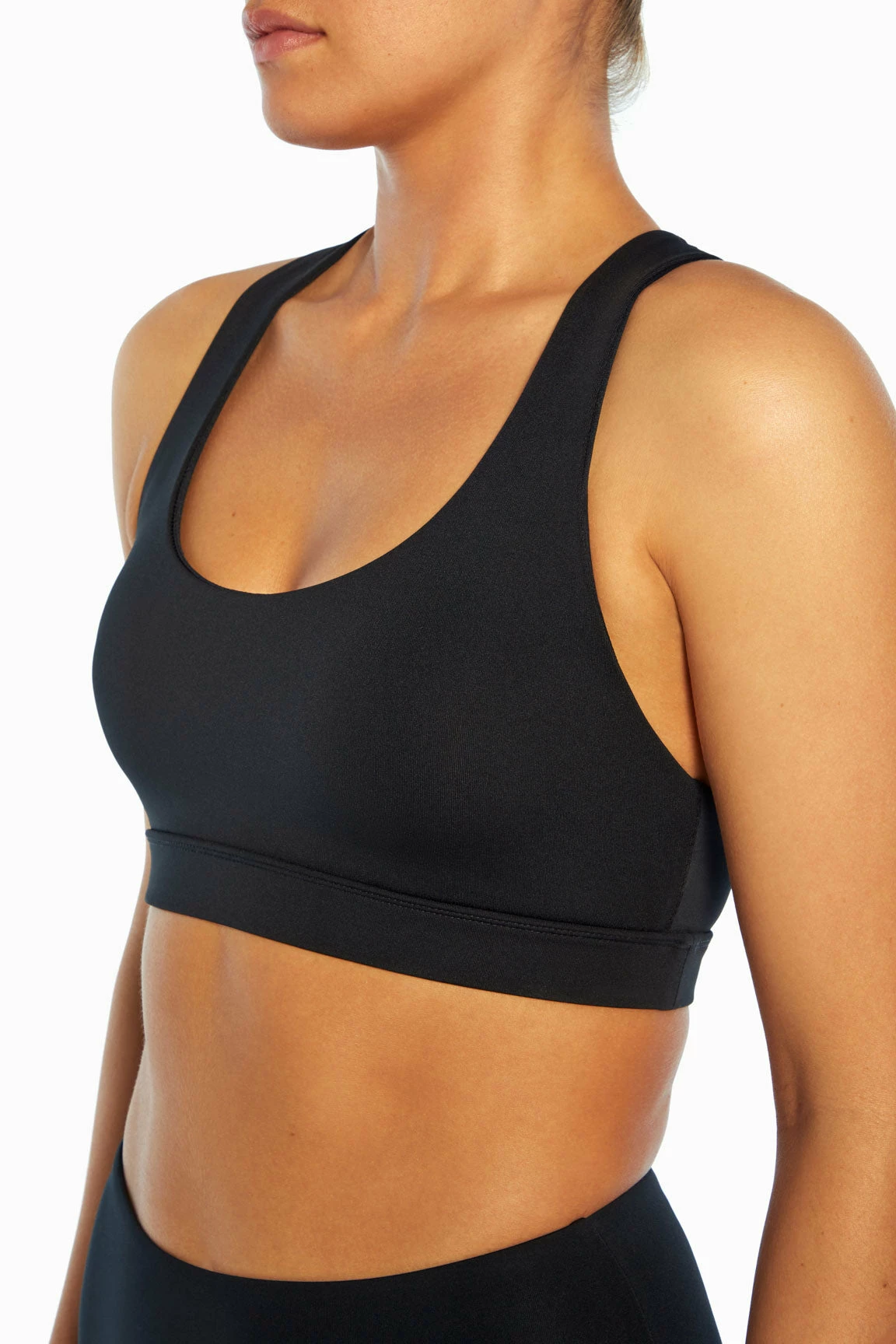 Don’t stop moving in this racerback sports bra with attractive elastic strappy back design — sweat is no problem with the moisture-wicking fabric.