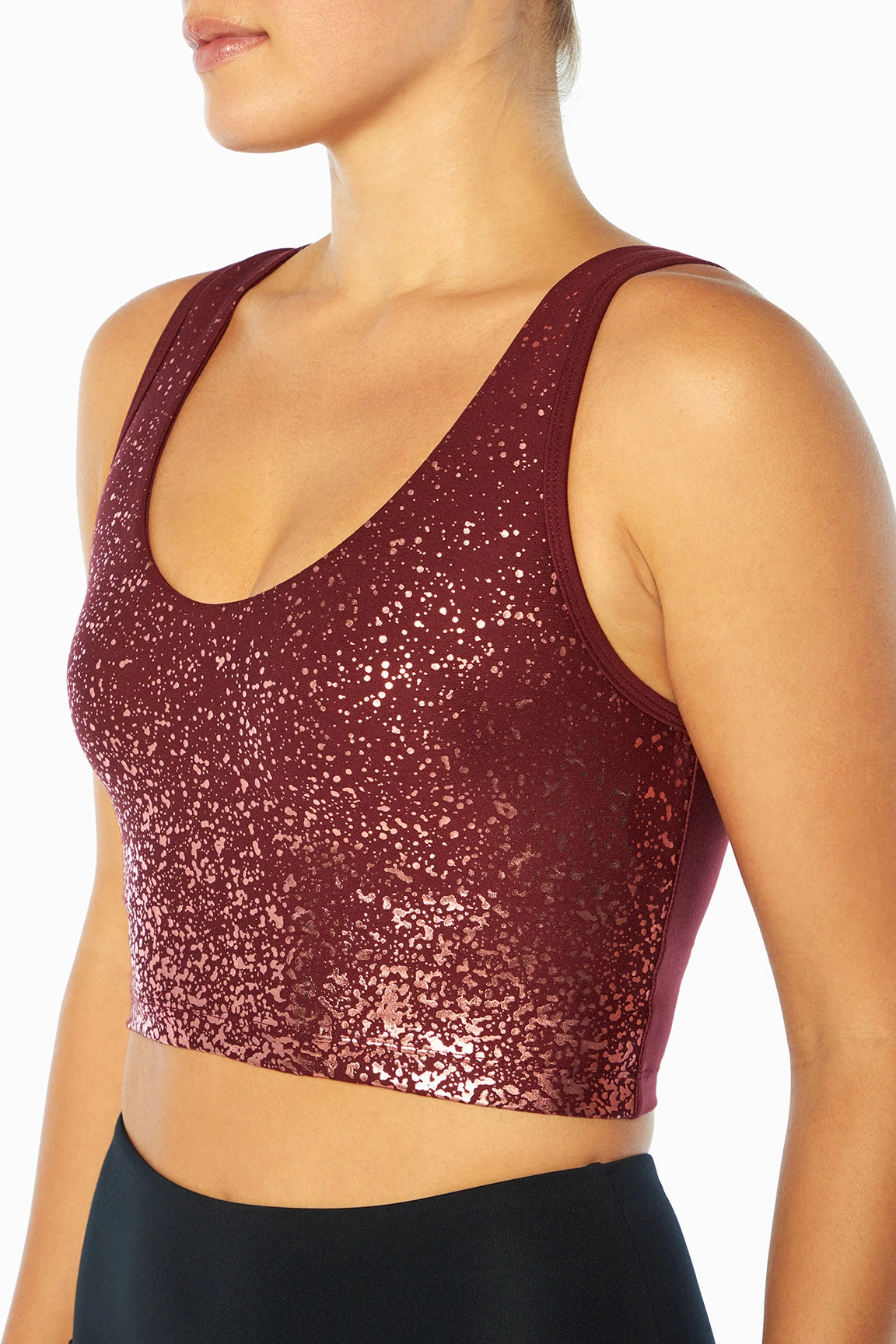 Soft inside and out and made for mid-impact workouts, this longline sports bra features a V-neck and back with crisscross strappy design, foil design, and moisture-wicking fabric.