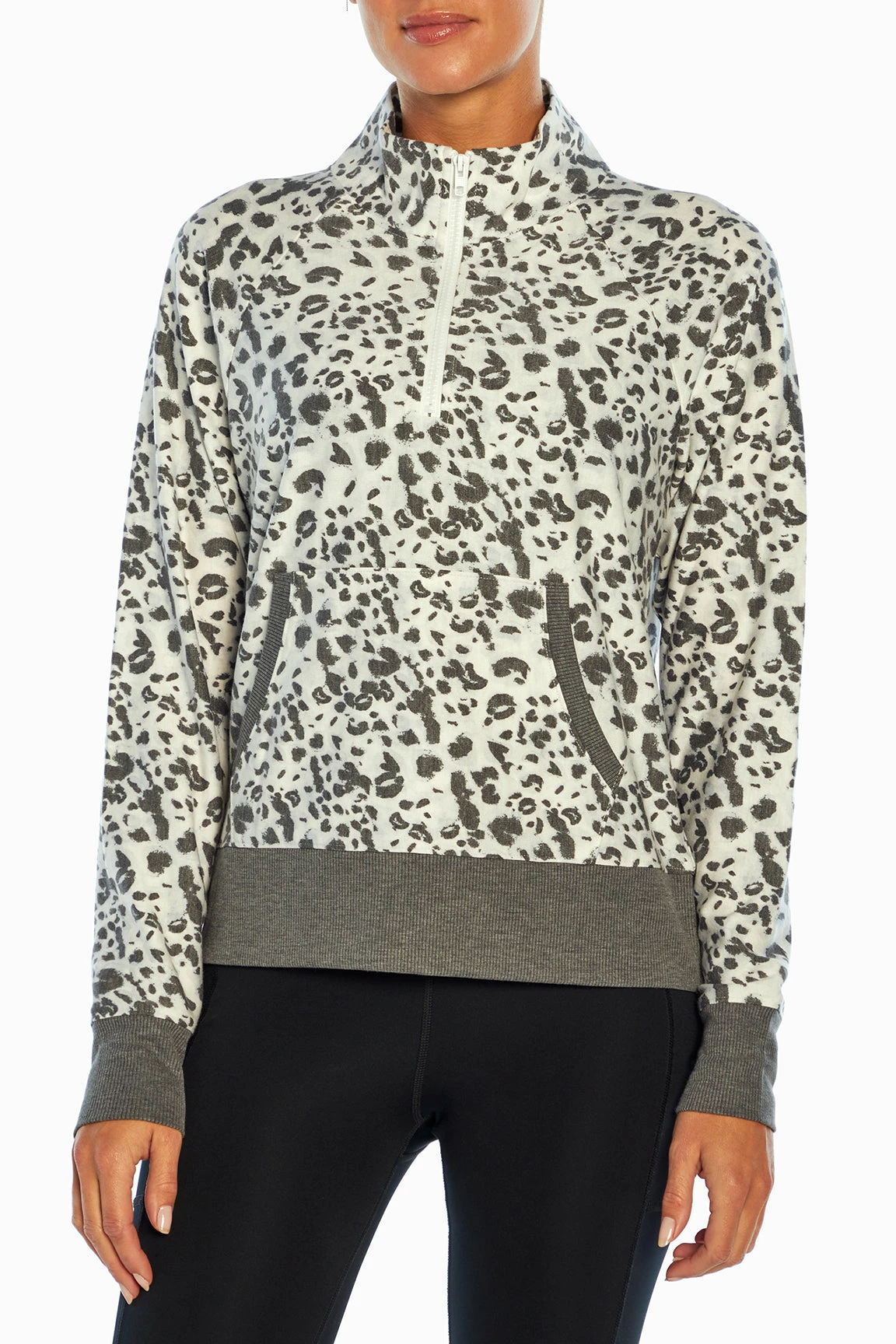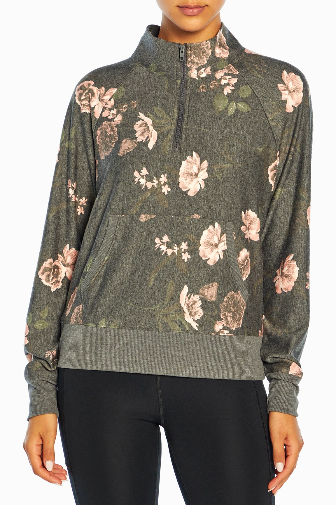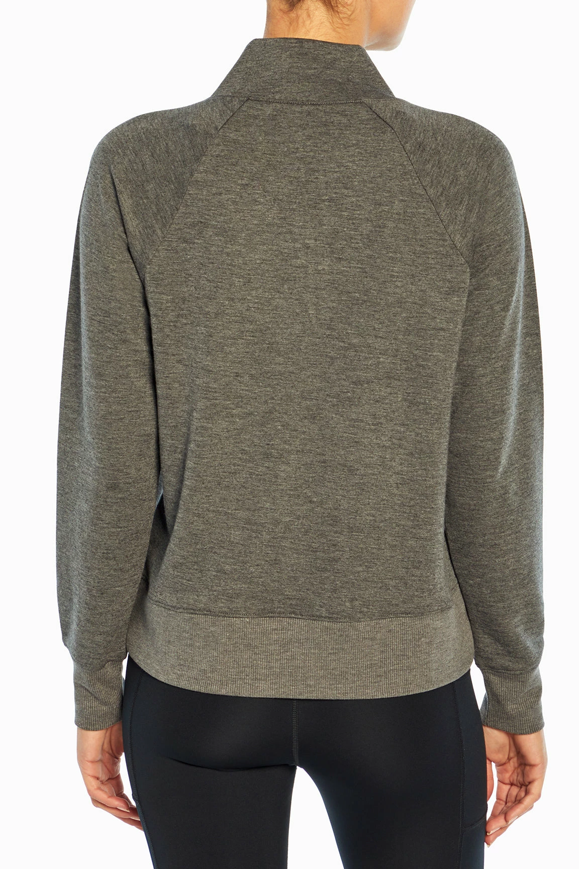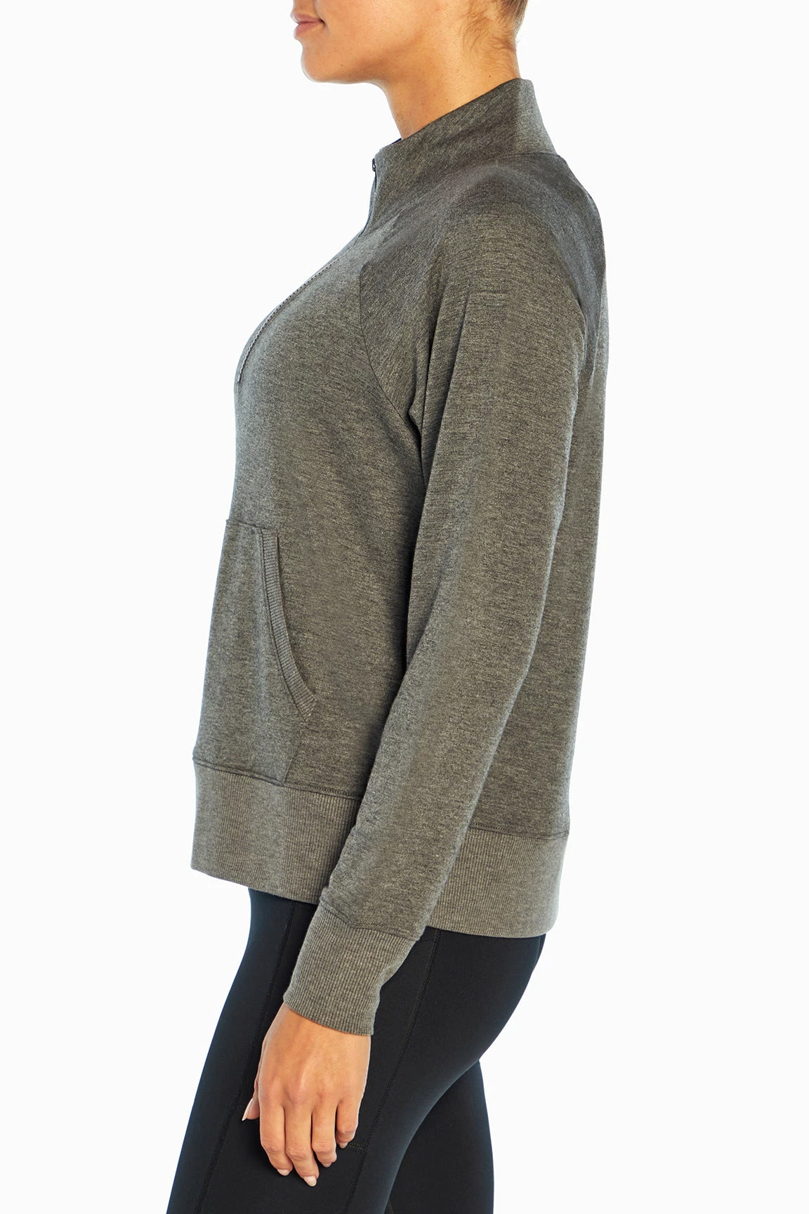 Pull this French terry jacket over your head and go, with its funnel neck, partial zip-front placket, raglan sleeves, front kangaroo pocket, and ribbed trim.