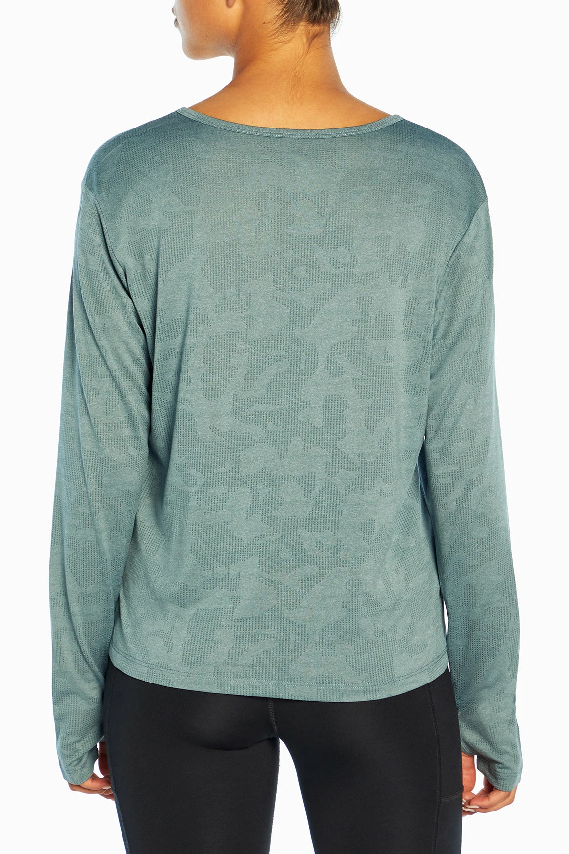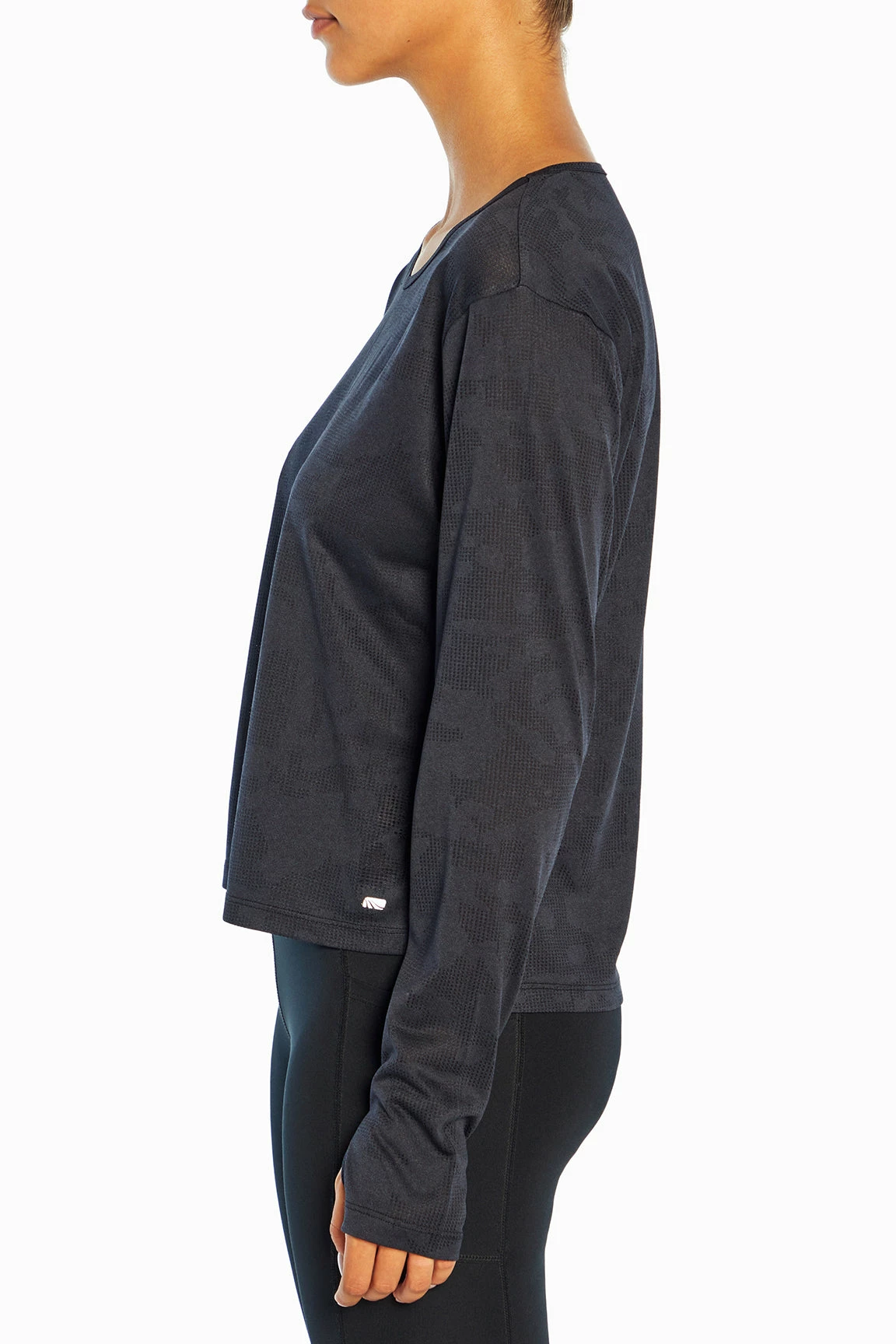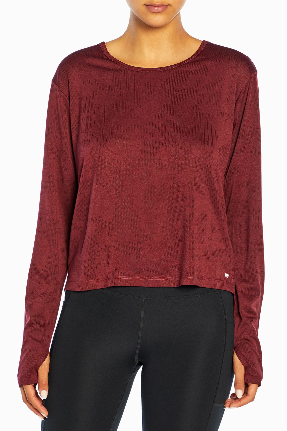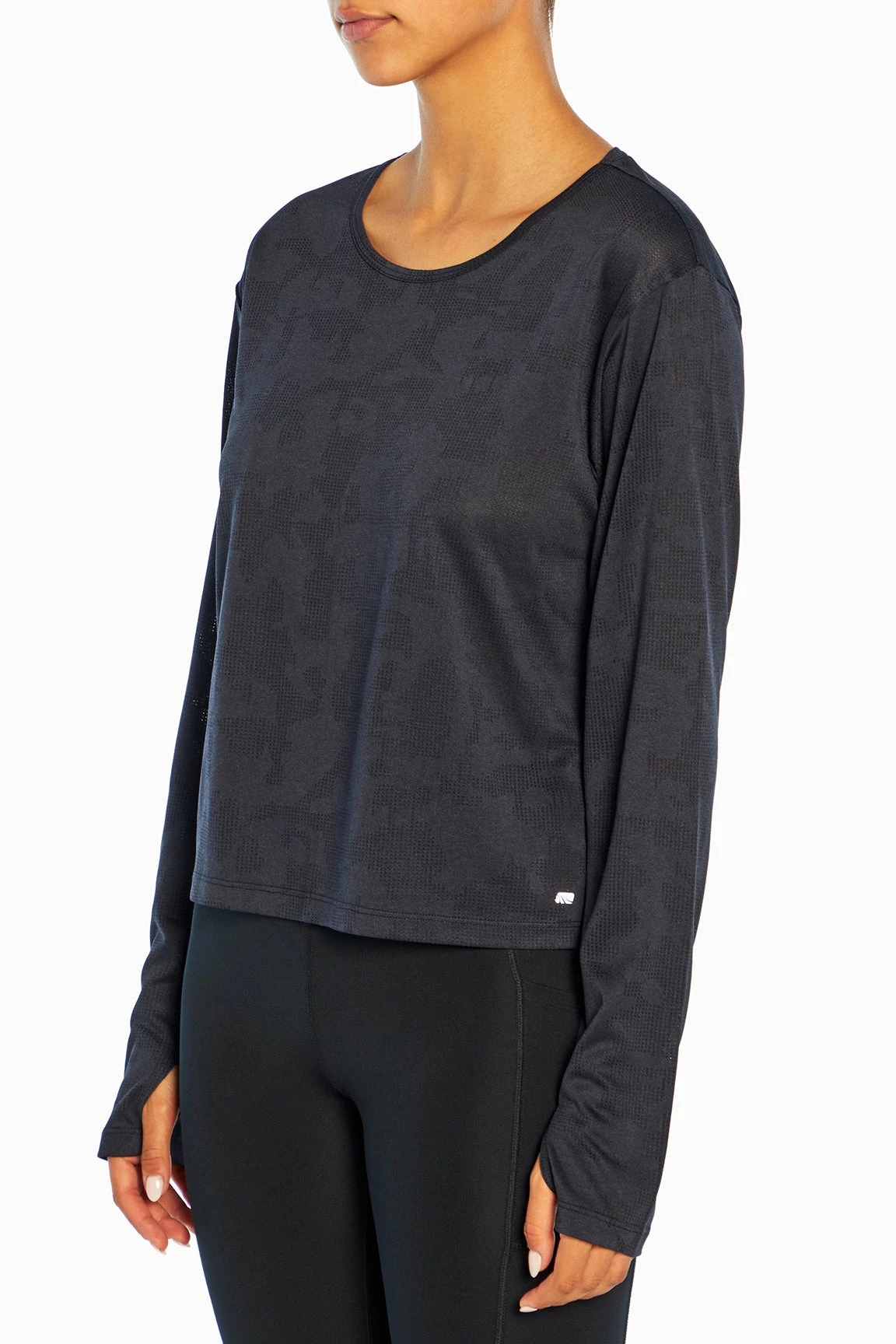 This jacquard-mesh top features a crew neck, comfy thumbholes, side slits, and a high-low hem.