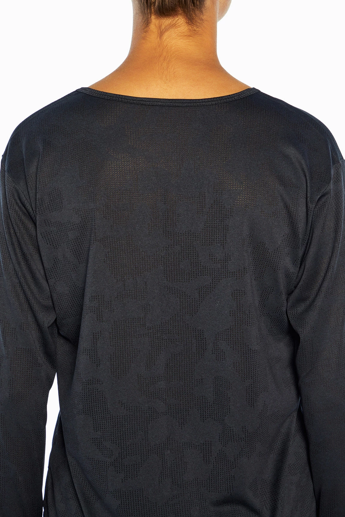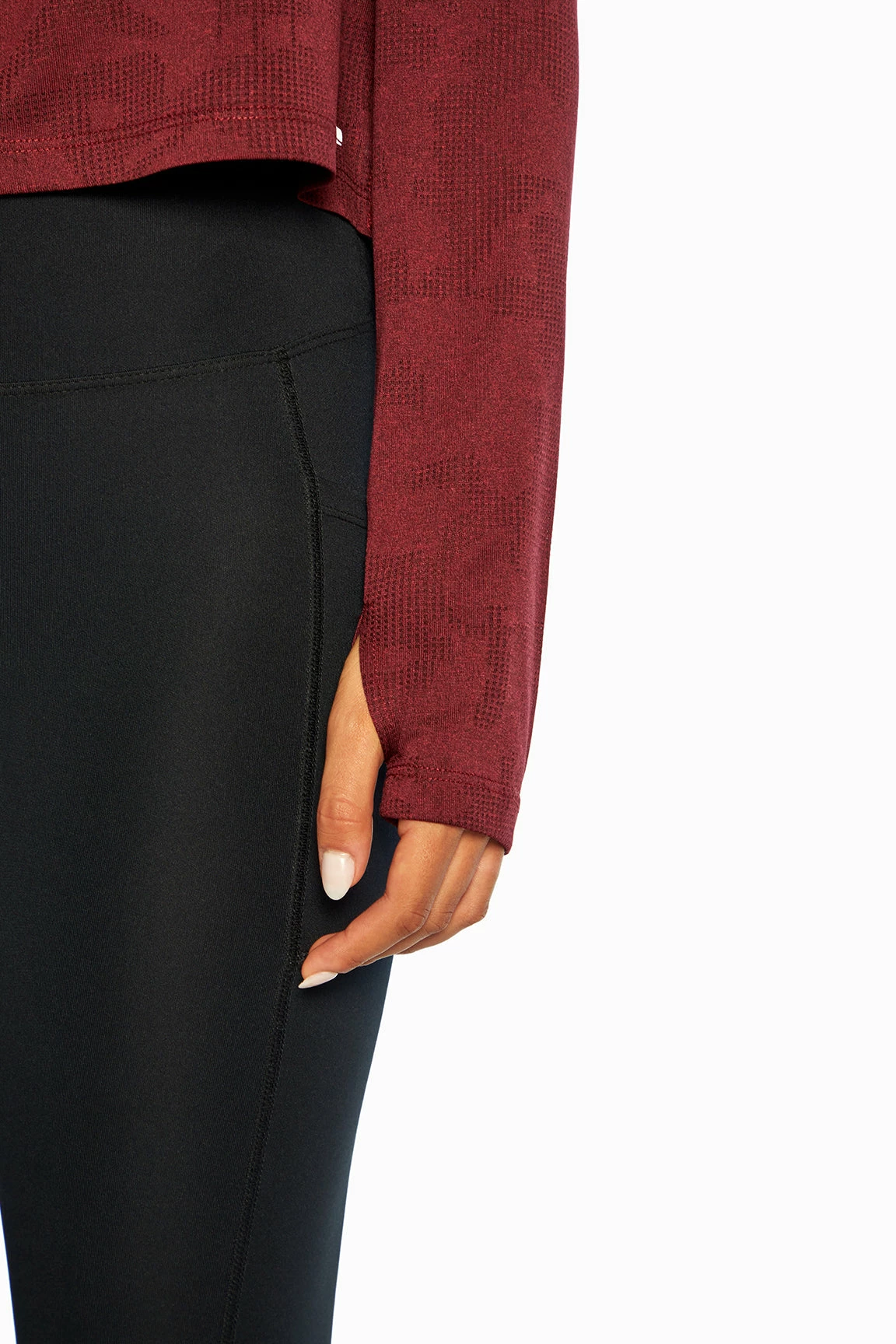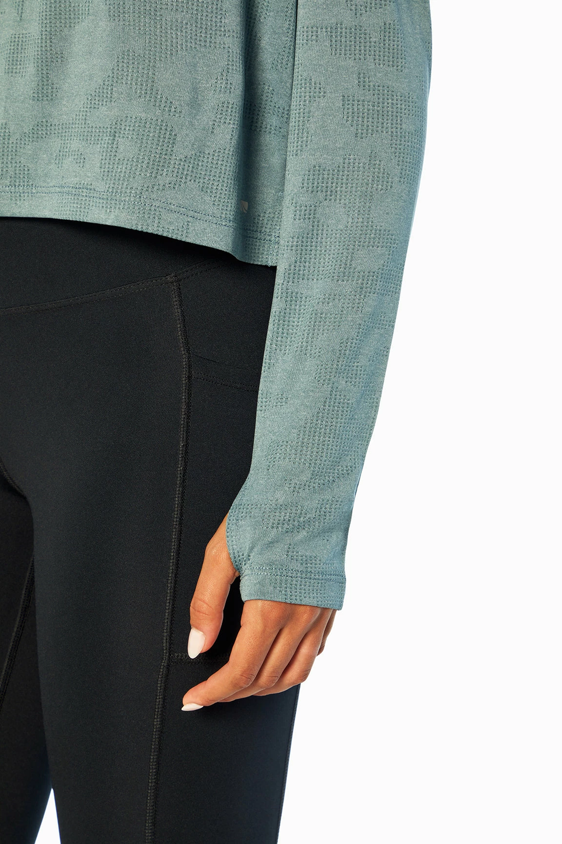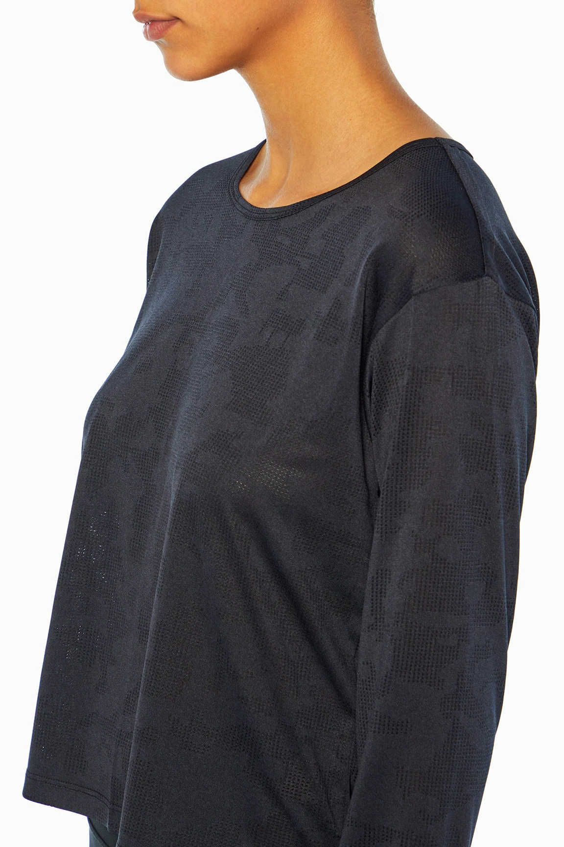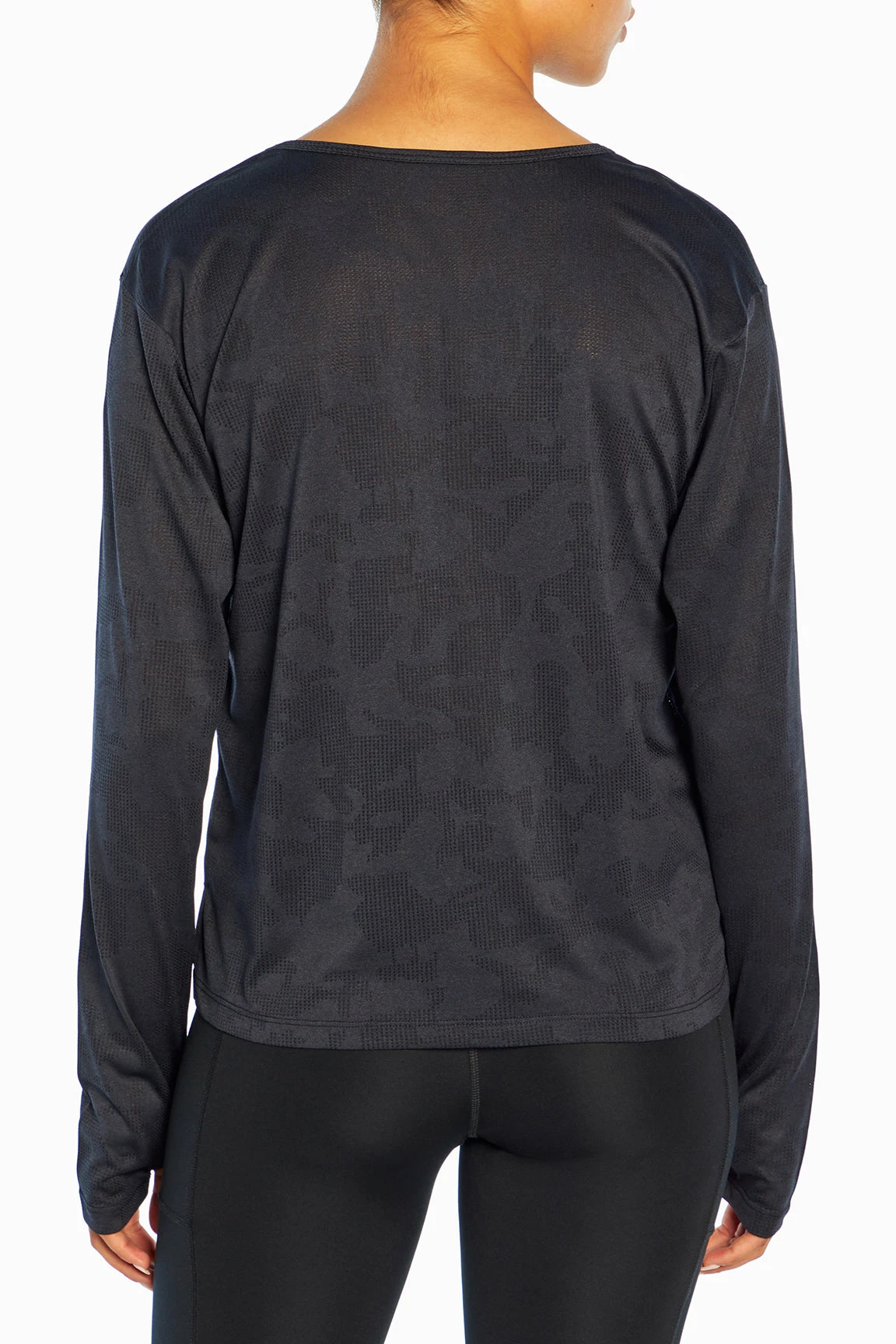 This jacquard-mesh top features a crew neck, comfy thumbholes, side slits, and a high-low hem.