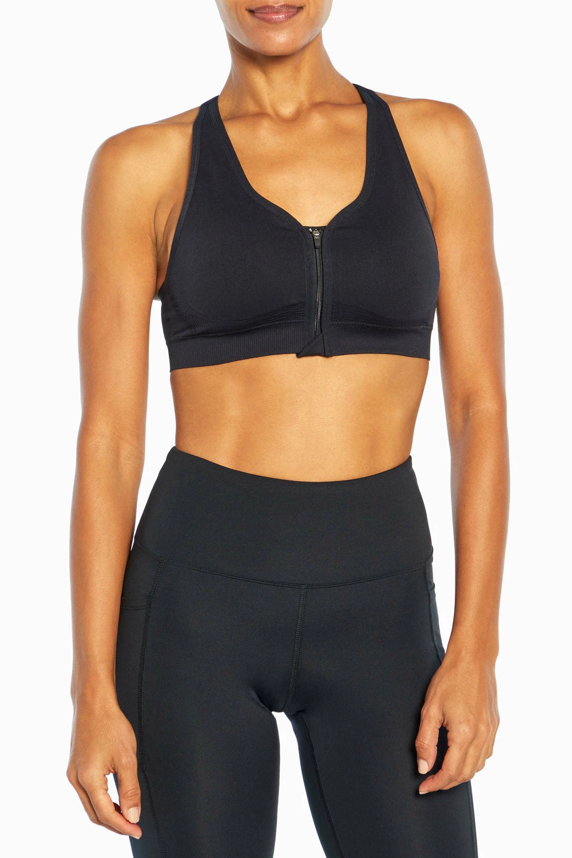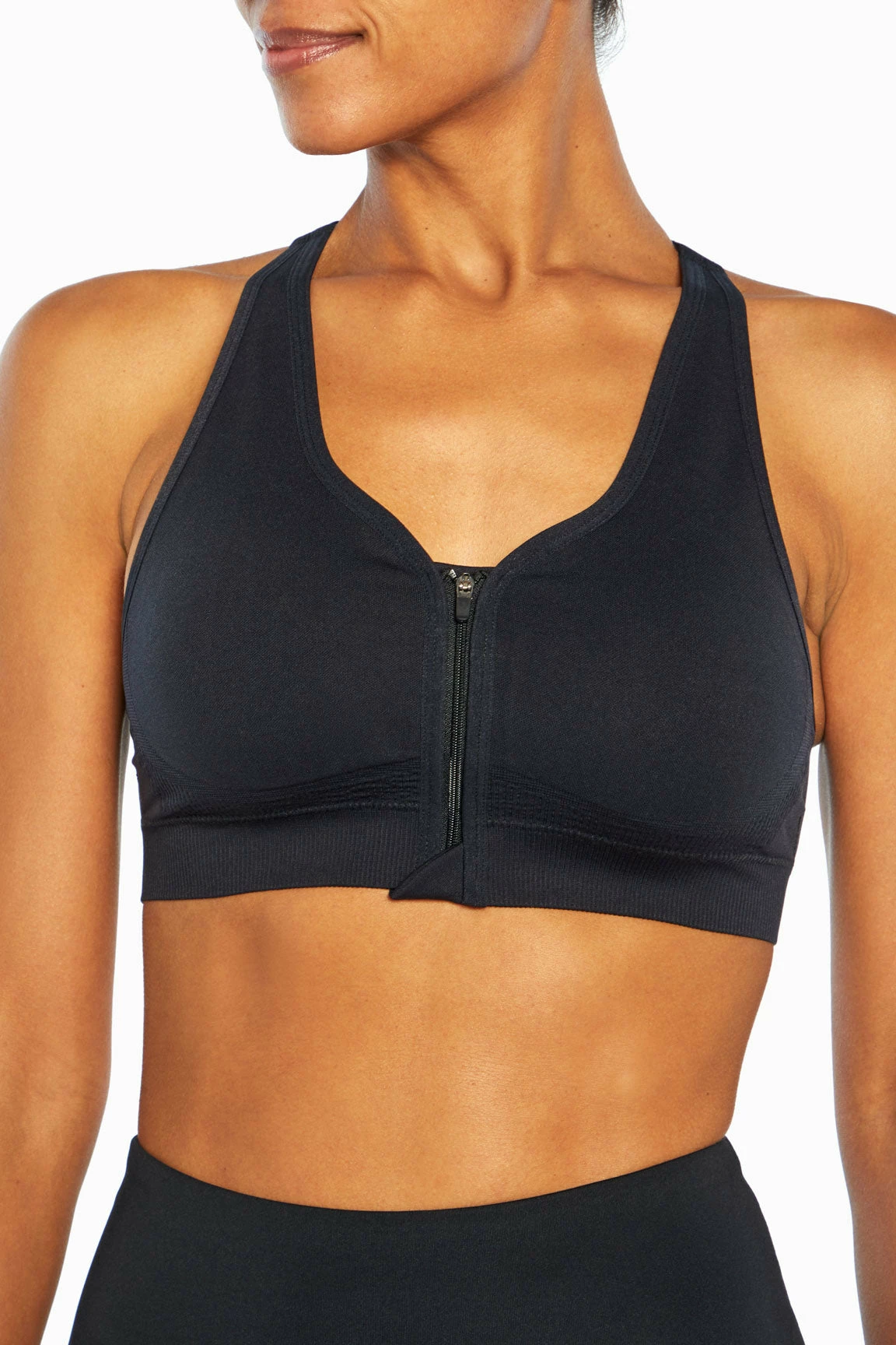 The convenient zip-front closure on this low-impact, seamless sports bra offers you comfort and functionality for your fitness plans — the adjustable straps, racerback, and back keyhole detail are bonus features.