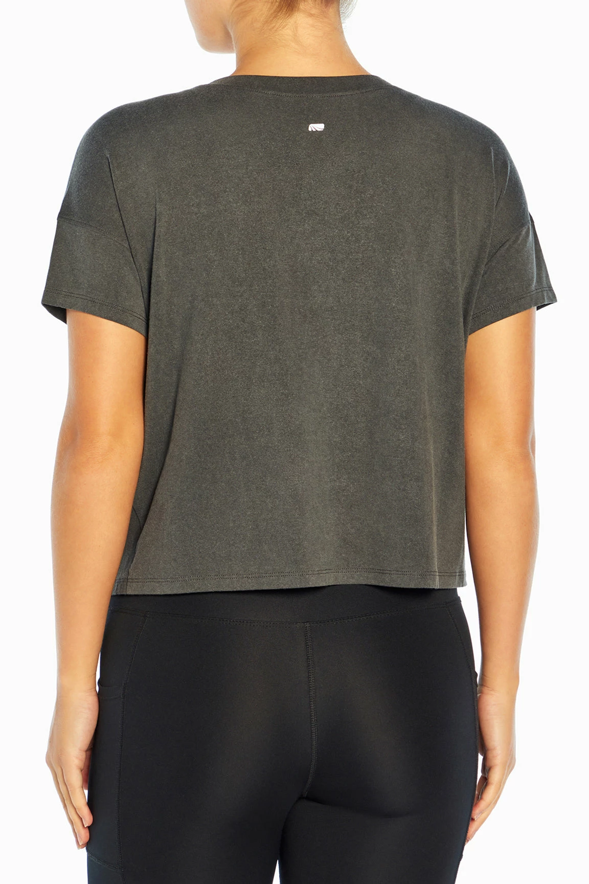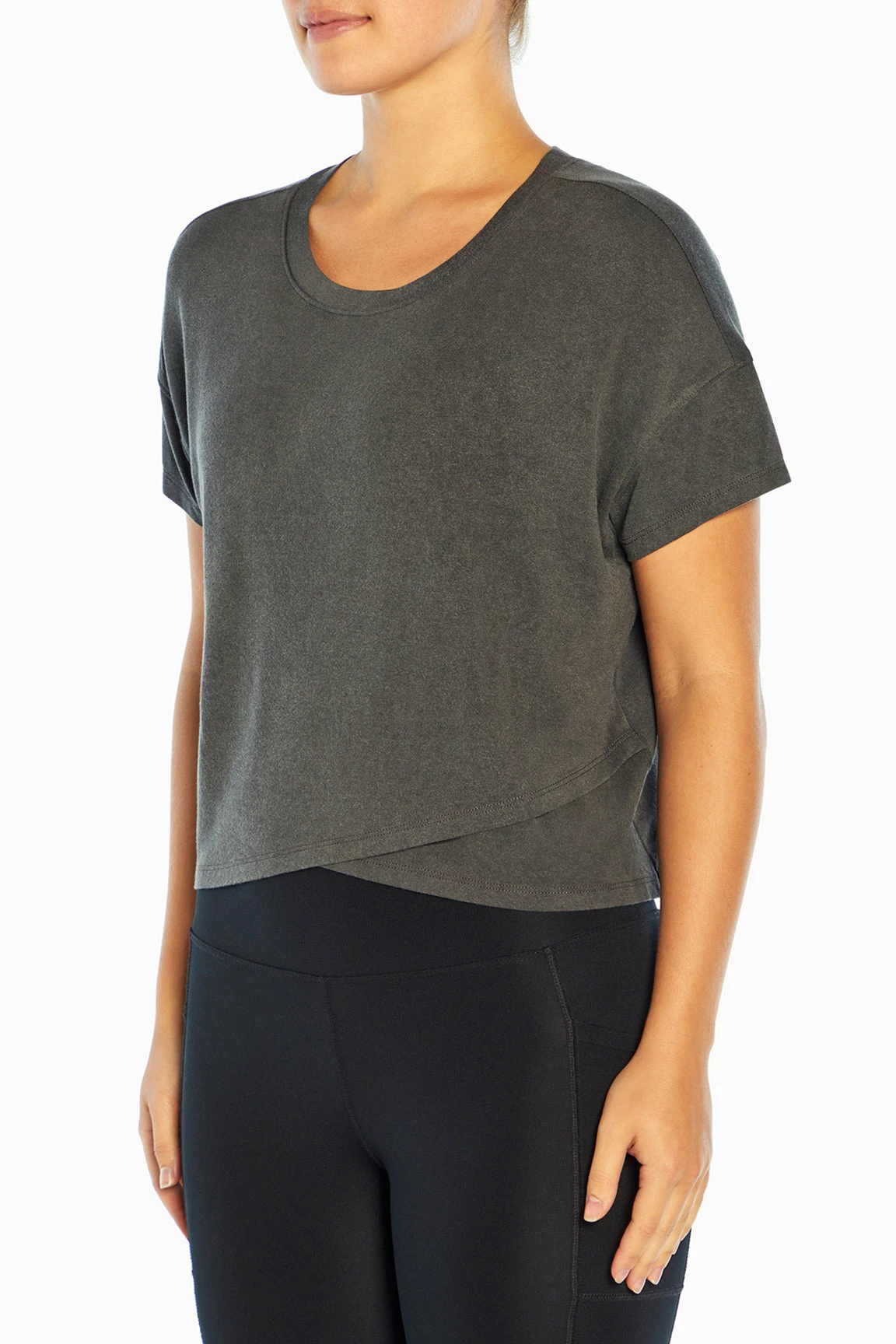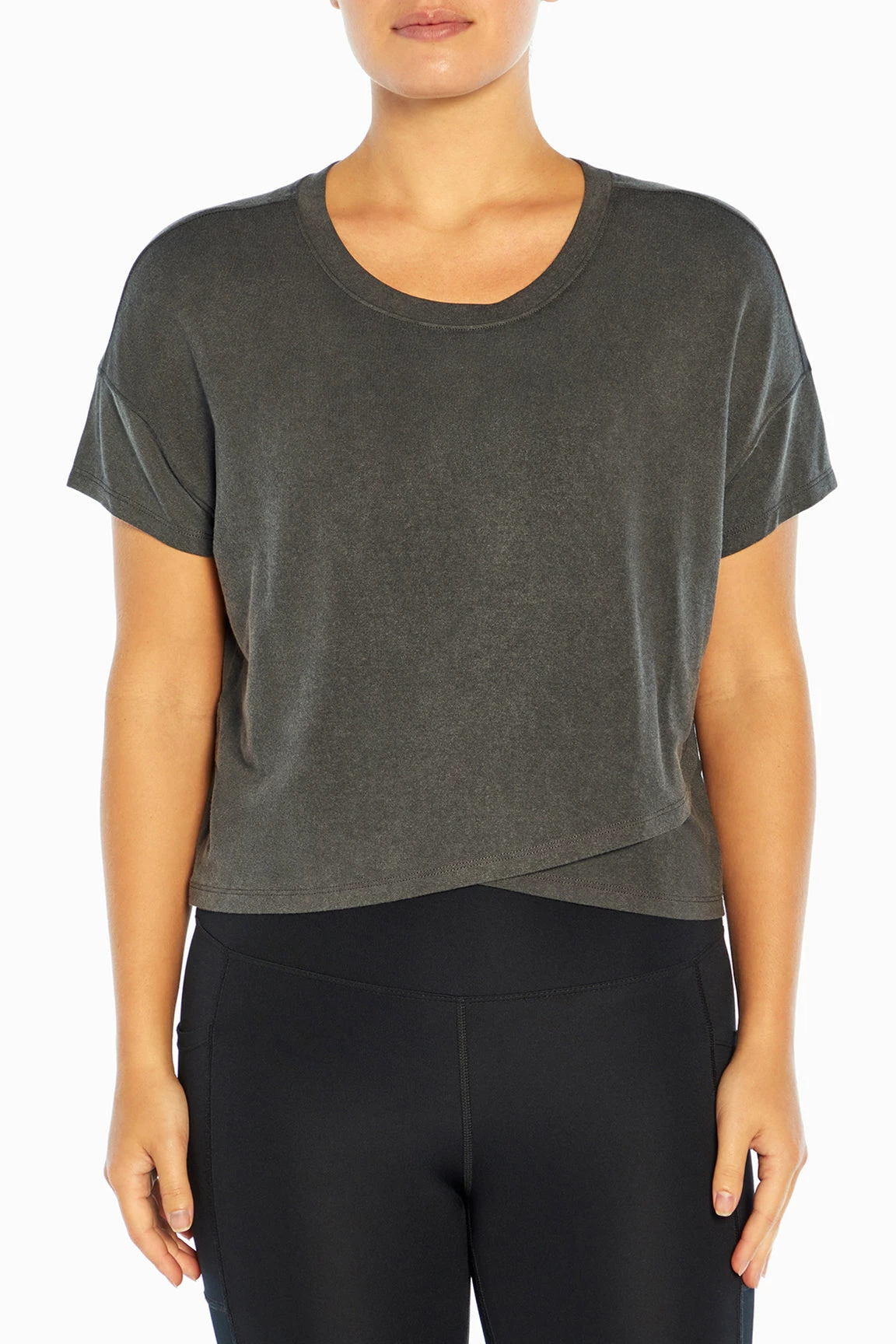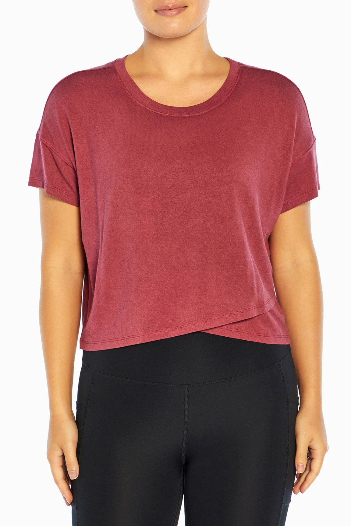 This tee is comfortable and stylish, with its crew neck, tulip hem, and classic silhouette.